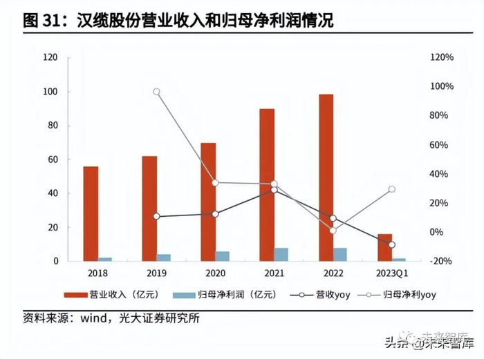 汉缆股份是我国电线电缆制造的龙头企业之一。公司主要业务覆盖集电缆及附件 系统、状态检测系统、输变电工程总包等,主要产品为电力电缆、装备用电缆、 特种电缆、数据电缆、架空线等。公司 2022 年实现营收 98.42 亿元,同比增长 9.58%,归母净利润 7.86 亿元,同比增长 1.10%。公司 2023 年一季度实现营 收 15.79 亿元,同比下降 8.63%,归母净利润 1.75 亿元,同比增长 29.65%。