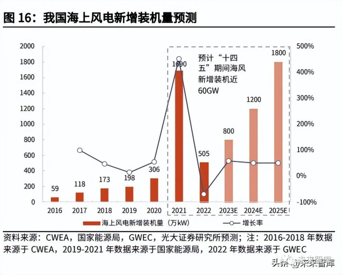 自 21 年 8 月起我国海风公开招标量超 20GW,“十四五”期间我国海风新增装 机量有望高速增长。根据我们的不完全统计,2021 年 8 月至 2023 年 5 月期间 我国海上风电招标量超 20GW,其中广东、山东、浙江三省的海风建设进度较快, 而江苏、辽宁、福建、广西、海南目前进度较慢,但其“十四五”期间海风规划 目标能够保障这些省份的海风招标逐渐起量。基于各省规划目标以及近两年招标 量,我们预计 2023/24/25 年我国海风新增装机量将达到 8/12/18GW,整个“十 四五”期间将近 60GW,是 2020 年底我国海风累计装机量 10.87GW 的 5-6 倍。