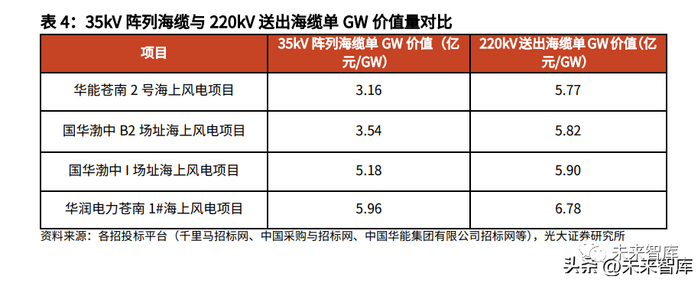 在阵列海缆方面:一方面,随着阵列海缆从 35kV 向 66kV 发展,阵列海缆能够 连接的风机数量增加,因此同样数量的风机所需要的阵列海缆减少;另一方面, 随着风机大型化发展,同样容量的风电场所设置的风机数量减少,阵列海缆需要 连接的风机数量也随之减少。在送出海缆方面:随着海上风电向深远海发展,离岸距离也随之增大,因此需要 长度更长的送出海缆将电能从海上升压站输送至陆上交流电网。海上风电场送出 海缆需求量呈上升趋势。在以上两个发展趋势的共同作用下,在海上风电场所用的所有海缆中,送出海缆 的比例将逐渐提升。根据海缆中标信息,同一风电场送出海缆的单 GW 价值量要 高于阵列海缆的单 GW 价值量,因此海缆整体平均单 GW 价值量有望提升。