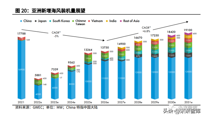 亚洲海上风电新市场逐渐兴起。近年来随着中国大陆海上风电市场快速发展,亚 洲的海风年新增装机量已经超过欧洲。根据 GWEC 的预测,从 2022 年起亚洲将 取代欧洲成为总装机容量最大的区域海上风电市场,并将一直保持到 2030 年底, 日本、韩国、中国台湾、越南、印度等地海风市场将逐渐兴起。