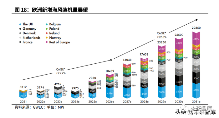 未来欧洲海上风电市场将快速发展。欧洲是海上风电产业的起源地,并且拥有成 熟的海上风电供应链。根据 GWEC 的预测,未来十年欧洲海风具备可观的增长 潜力,这主要受益于以下几点:(1)海上风电已成为继陆上风电和光伏之后最 具竞争力的可再生能源发电技术之一;(2)浮式风机商业化的推动将逐渐释放 深远海风资源的开发潜力;(3)欧盟海上可再生能源战略目标是在 2050 年累 计装机 300GW;(4)俄乌冲突后欧盟委员会发布 REPowerEU 计划,希望在 2030 年之前使欧洲不再依赖俄罗斯的化石燃料。分时间段来看,2022-2024 年欧洲海风装机主要依靠英国、德国、荷兰、法国等 成熟市场,并且这些成熟市场活动水平也并不高,因此这段时间欧洲海风装机增 长相对缓慢。从 2025 年开始,一方面,新的海风项目将逐渐从已公布的竞拍计 划中释放;另一方面,比利时、波兰、爱尔兰、挪威等新兴市场开始放量。因此, 2025 年之后欧洲海风新增装机将快速增长。