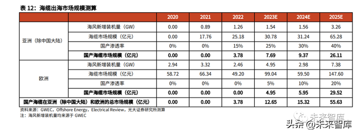 此前,中国的部分风电零部件,如铸件等已经在海外占据一定份额,当前风机整 机、海缆等代表先进制造的环节也将不断地提升自身海外渗透率。根据我们的测 算,2025 年海缆出海亚洲(除中国大陆)和欧洲的市场空间将达到约 56 亿元, 2022-2025 年复合增速约 145%。关键假设如下:(1)海风新增装机量:2020 年-2025 年亚洲(除中国大陆)和欧洲的海上风电 新增装机量数据来源于 GWEC;(2)海缆单 GW 价值量:根据海外海缆公开中标信息,位于法国的容量为 496MW 的 Saint Brieuc 海上风电场,其阵列海缆和送出海缆分别采用 66 kV HVAC XLPE 三芯海缆和 225kV 三芯海缆,中标人分别为 Prysmian 和 Nexans,总价分别为 0.8 亿欧元和 1.15 亿欧元,折合单价分别约为 1.61 亿欧元/GW 和 2.32 亿欧元 /GW。该项目阵列海缆+送出海缆的总单价约为 3.93 亿欧元/GW,以 1 欧元=7.25 人民币的汇率进行折算,总单价约为 28.50 亿元/GW。鉴于该项目采用 66kV 阵 列海缆,价值量显著高于 35kV 阵列海缆,并且送出缆中标产品内包含 93km 的 225kV 单芯陆缆在内,因此该单价偏高。综合考虑后,我们合理假设海外海缆单 价水平为 20 亿元/GW。(3)国产海缆渗透率:综合考虑国内海缆企业已获得的海外订单,以及未来具 备进一步获得订单的能力,我们合理假设 2020 年-2025 年国产海缆在亚洲(除 中国)的渗透率为 0%/0%/15%/25%/30%/40%,在欧洲的渗透率为 0%/0%/0%/5%/10%/20%。