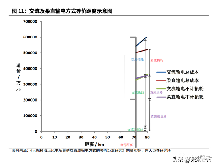 随着海上风电向深远海发展,柔性直流输电送出是更优选择。根据《大规模海上 风电场集群交直流输电方式的等价距离研究》,若仅考虑设备投资成本,百万千 瓦风电场群交直流输电方案的等价距离约为 75.1 km ;若进一步考虑输电系统 全生命周期的总成本,风电场交直流输电方案的等价距离约为 63 km。此外,交 直流输电方式的等价距离并不是固定不变的,未来随着技术的不断进步,柔直设 备造价有望持续降低,从趋势上看未来交直流输电的等价距离有望逐渐缩短。