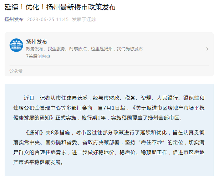 不仅是连云港,近期全国多地陆续出台楼市新政。据微信公众号“扬州发布”6月25日消息,扬州市住建局经与市财政、税务、资规、人民银行、银保监和住房公积金管理中心等多部门会商,自7月1日起,《关于促进市区房地产市场平稳健康发展的通知》正式实施,施行期1年,实施范围覆盖了扬州全部市区。