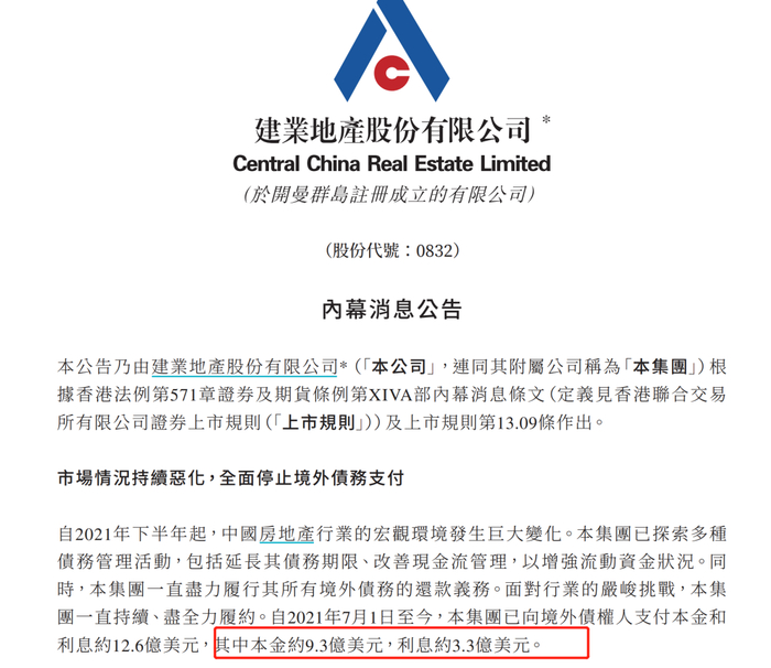 6月23日,建业地产发布公告称,公司未能在2023年6月23日宽限期结束之前支付2024年到期之7.75%优先票据的利息,将暂停向所有境外债权人进行支付,以确保公平对待所有境外债权人。