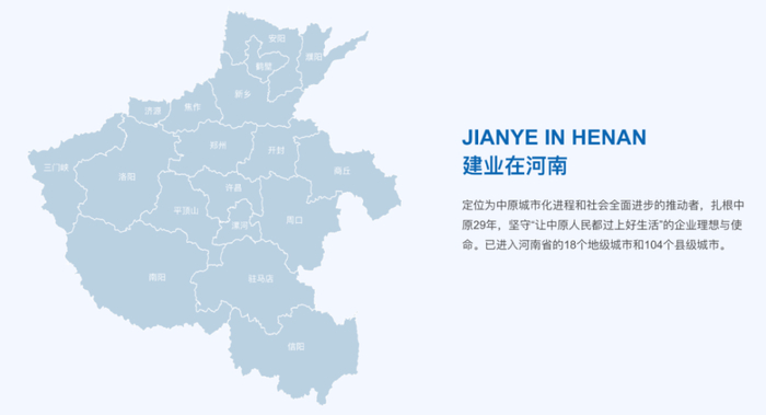 2015年,建业从房地产开发商向新型生活方式服务商转型,并逐渐布局物业、代建、装配式建筑等相关领域。如今,除建业地产外,其他三个业务板块均在香港主板上市。2019年,建业地产实现了在河南省县及县以上市场全覆盖。