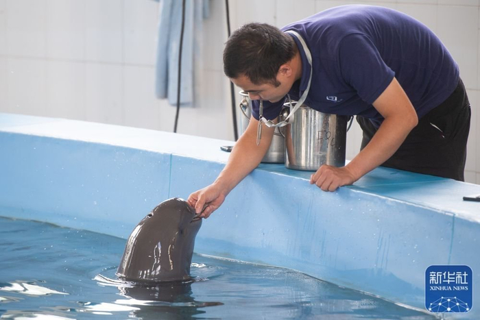 6月27日,中科院水生所白鱀豚馆饲养员给小江豚“F9C22”喂食。