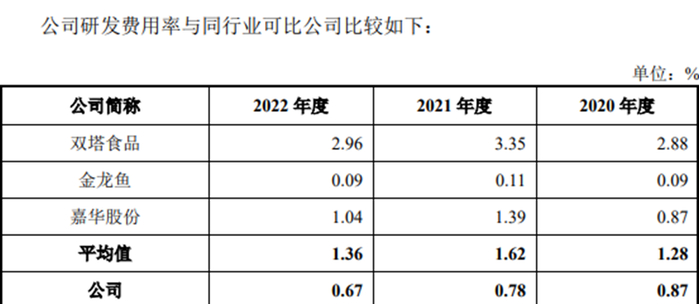 索宝股份研发费用率显著低于同行业可比公司平均值的1.28%、1.62以及1.36%。公司表示,研发费用率高于金龙鱼,和嘉华股份差异较小,低于双塔食品。双塔食品主营业务主要包括粉丝、豌豆蛋白、食用菌等业务板块,与公司在产品和业务结构上存在较大差异,并且双塔食品已上市多年,资金实力雄厚,研发投入相对较大。