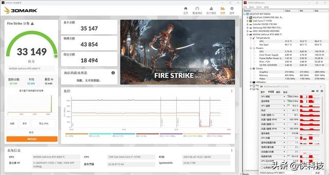 在3DMark的Fire Strike(DX11+1080P渲染分辨率)测试中,总成绩为33147,其中技嘉猎鹰RTX 4060 Ti Eagle显卡的分数为35147。