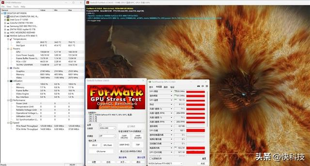 在超频过程中,我们将GPU频率拉高了200MHz,提升至2490MHz-2715MHz,超频后显存提升至336GB/s,显存等效频率升到了21Gbps,这也已经是RTX 4060 Ti的上限了。