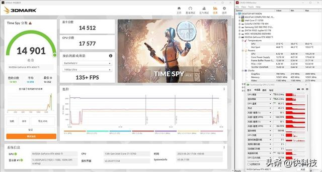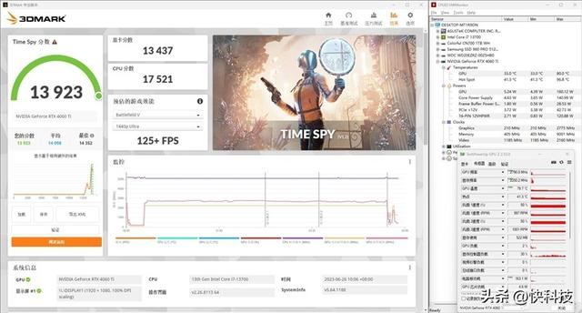 在3DMark的Time Spy(DX12+2K渲染分辨率)测试中,总成绩为13923,其中技嘉猎鹰RTX 4060 Ti Eagle显卡的分数为13437。