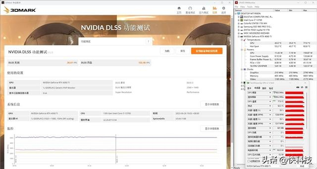 测得结果,关闭DLSS帧数为36.61 FPS,开启DLSS后帧数为132.46 FPS,提升幅度约261.8%。
