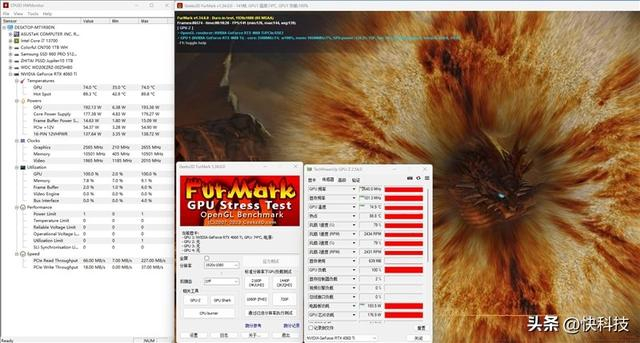 重新烤机15分钟后考察超频后的稳定性,此时技嘉猎鹰RTX 4060 Ti Eagle显卡的GPU频率在2535MHz,功耗在192W,温度为74℃。