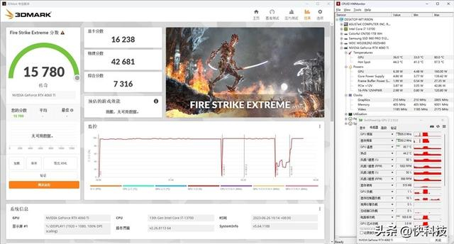 在3DMark的Fire Strike(DX11+2K渲染分辨率)测试中,总成绩为15780,其中技嘉猎鹰RTX 4060 Ti Eagle显卡的分数为16238。