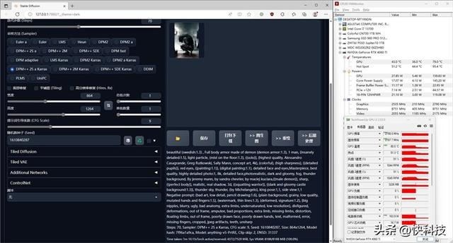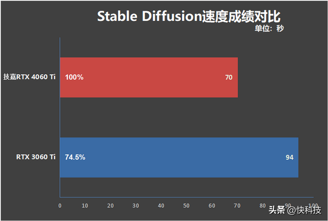 在速度上,技嘉猎鹰RTX 4060 Ti Eagle显卡只需要70秒就能够根据关键词生成一张图片,而同平台下RTX 3060 Ti出图速度耗时94秒,效率要快了约34.3%。