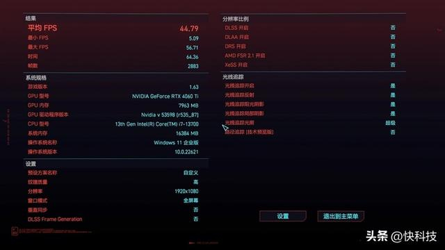 在《赛博朋克2077》在1080P分辨率+预设超级光线追踪的基础上,仅开启光追并关闭DLSS,测得平均帧率为44.79 FPS。