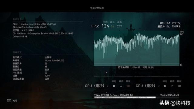 在《刺客信条:英灵殿》1080P+预设极高画质下,平均帧数为124 FPS。