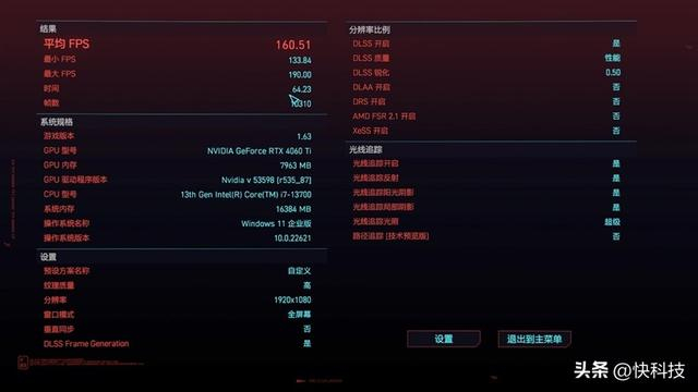 在原有画质上开启DLSS性能模式+帧生成,测得游戏平均帧率为160.51 FPS,提升幅度258.4%。