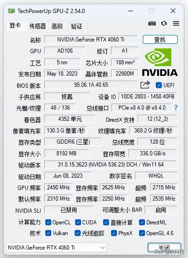 这款显卡使用了AD106核心,启用了34组SM、4352个流处理器、34个第三代RT核心和136个第四代Tensor核心。