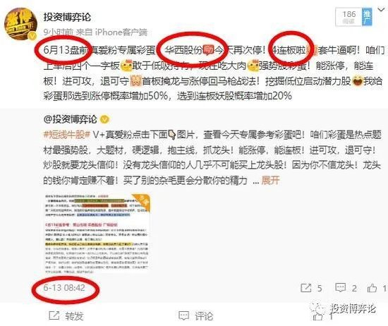 6月13号在我微博:投资博弈论!上分析的 华西股份 逆势涨停4个一字板!我微博上分析的彩蛋还有很多个涨停板哦!