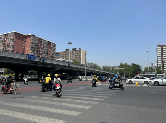 在烈日下,南北向2分30秒的红灯也显得如此漫长。只见一位骑手在劲松桥东南角的斑马线上等了约1分钟便等不及了,口中念叨着,“超时了,超时了”,左右看看,见没有车辆,迅速骑到北边。此时,等在一旁的其他骑手见状也赶紧跟上,一起闯灯骑到了对面。还有的骑手干脆无视前方交通信号灯,只根据两侧有没有车辆和行人来判断能不能通行。
