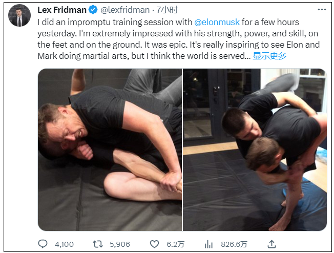 随后,莱克斯·弗里德曼还在推特上公布了两张和马斯克一起进行训练的照片。莱克斯·弗里德曼表示,26日当天,他和马斯克进行了几个小时的即兴训练。莱克斯·弗里德曼说,马斯克的体力、力量和技术给他留下了深刻的印象。