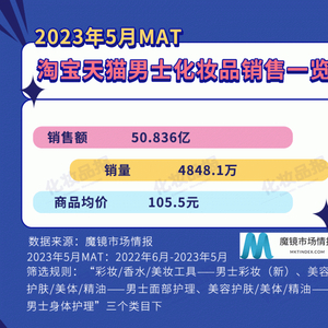 魔镜市场情报统计的数据显示,2023年5月MAT(2022年6月-2023年5月)滚动年期间,淘宝天猫、京东、抖音三平台男士化妆品销售总额超过77亿元。
