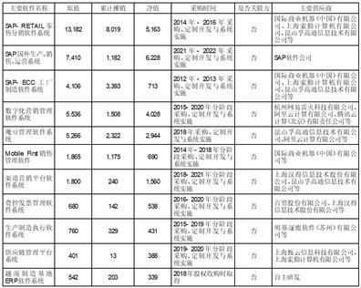 回复:公司无形资产中办公软件主要是指国内、国外 SAP-ERP 系统、网络营销系统等大型 ERP业务集成系统,基本是“对外采购套装软件+定制开发与系统实施服务”的大型软件系统,实施期限均超过一年以上,此类软件金额占比约在85.50%。具体软件金额情况如下表所示: