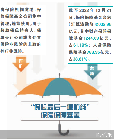 可以看出,保险保障基金的设立对于受困中的保险公司而言是一种有效的风险处置机制,一方面可以通过资金的注入使得受困的保险公司转危为安,另一方面也可在退出阶段获得一定投资收益。截至2022年末,保险保障基金余额(汇算清缴前)2032.98亿元。其中,财产保险保障基金1244.03亿元,占比61.19%;人身保险保障基金788.95亿元,占比38.81%。