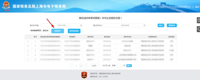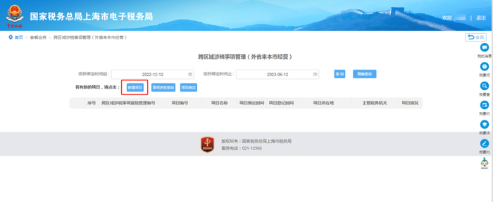 二、点击【新建项目】,填写跨区域涉税事项报告表表单;确认填写信息无误后,点击【提交】;