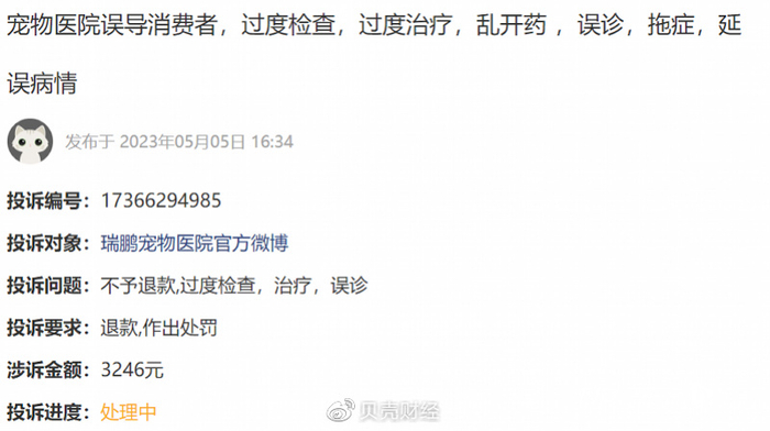 在瑞鹏宠物医院,有消费者投诉其消费过程中 ,因为消费金额差异大,对宠物医院提出质疑。记者多方联系采访,截至发稿尚未获得瑞鹏宠物医院的有效回复。