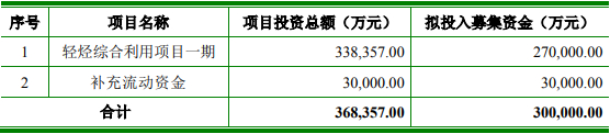 宇新股份本次向特定对象发行股票的募集资金总额(含发行费用)为不超过300,000.00万元(含本数),扣除发行费用后的募集资金净额拟用于轻烃综合利用项目一期和补充流动资金。