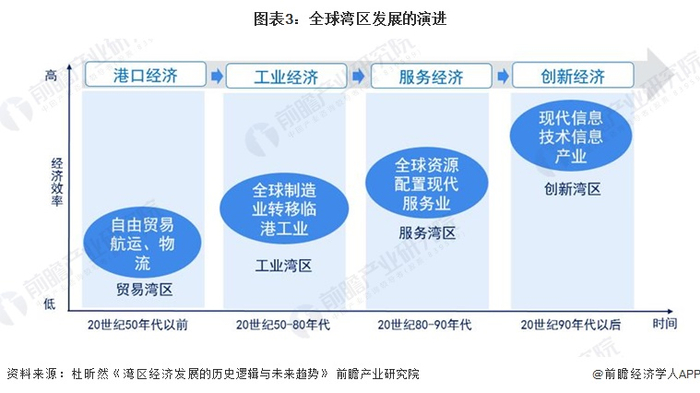 湾区发展演进过程可分为四个阶段,分别是贸易湾区、工业湾区、服务湾区和创新湾区。