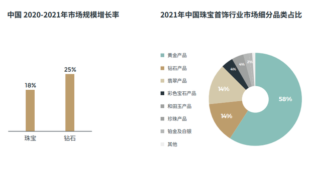 虽然钻石产品尤其是钻戒近年来负面不断,全球市场低迷,不过国内的市场可以用“风景这边独好”来形容。据中宝协统计,中国珠宝消费市场以黄金为主导,钻石与翡翠并列,是仅次于黄金的第二大细分珠宝品类,占比显著高于其它珠宝。2021年我国钻石产品整体市场规模约为1000亿元,同比增长25%,占整体珠宝首饰行业市场份额的14%。