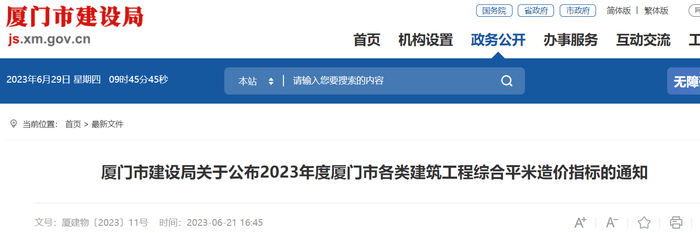 厦门市建设局关于公布2023年度厦门市各类建筑工程综合平米造价指标的通知