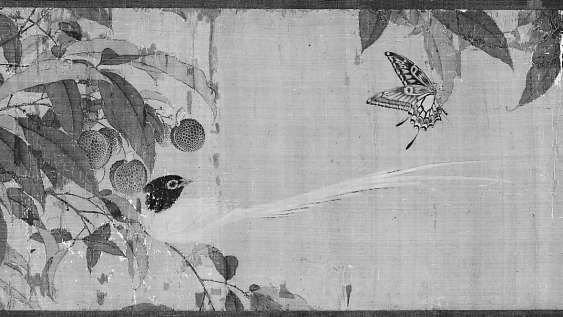 爱荔枝的食客们不仅写诗文赞叹荔枝,也用妙笔丹青描绘荔枝。传为宋徽宗所绘的《写生翎毛图》便生动地描绘了荔枝成熟、鸟儿垂涎欲食的趣味场景。画家对荔枝的刻画极其细致,观者可以清晰地看到每一颗荔枝上大小不一的凹凸斑点。荔枝的大小、颜色、形状、姿态、方向、位置、成熟状态各不相同,硕大的果实掩映在树枝绿叶间,让人感受到果实成熟的喜悦,甜美的果实气息从画面中飘来。羽毛亮丽的鸟儿看着枝头硕大的果子,早已垂涎三尺,它们张嘴鸣叫,似乎在和同伴商量如何啄破荔枝坚硬的外皮。蝴蝶翩翩起舞,栀子花迎风怒放,共同呈现出夏天自然界的魅力风姿。宋徽宗主张状物精细入微,注重表达自然的生机,从这幅画中,我们可以感受到他鲜明的绘画风格,穿插有致的物象间洋溢着迷人的自然生趣。