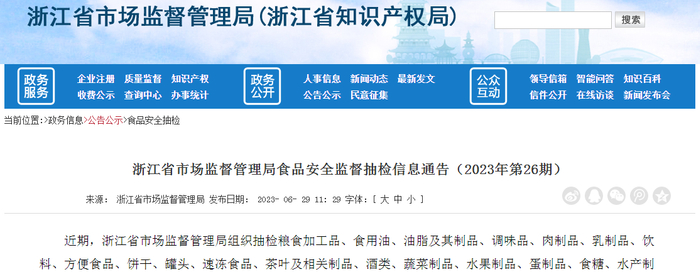 中国质量新闻网讯 2023年6月29日,浙江省市场监督管理局发布食品安全监督抽检信息通告(2023年第26期)。