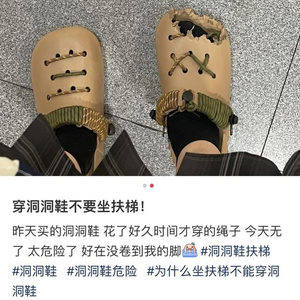 然而,近日在社交平台上,有不少网友分享自己穿洞洞鞋的惊险经历,并纷纷呼吁“穿洞洞鞋不要坐扶梯!”此前,也有媒体报道,有3岁儿童穿洞洞鞋坐扶梯时,洞洞鞋被卷入电梯,脚趾严重受伤。