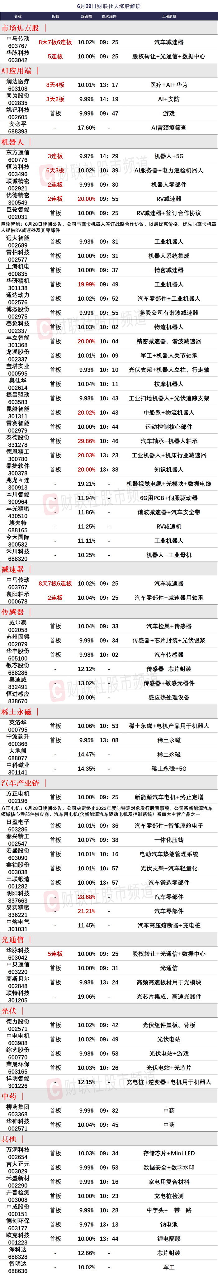 传感器以及永磁材料等机器人上游材料及零部件方向同样得到资金的深度挖掘,传感器板块威尔泰、苏州固锝、华丰股份涨停,敏芯股份、奥迪威、恒进感应涨超10%。稀土永磁板块英洛华、宁波韵升涨停,大地熊、中科磁业大涨14%。中信证券指出,本次北京市机器人产业三年行动方案提出,要求攻克力、热、光、电等先进传感器设计、制造、封测技术,优化精密加工工艺,提升微机电系统(MEMS)的工艺稳定性和良品率,研制3D视觉、热成像、六维力、激光雷达等传感器,加快突破肌电、脑电等前沿传感器技术。微机电系统(MEMS)生产技术与工艺有望在政策支持下持续提升,推动MEMS传感器成本下降、体积优化、性能提升,最终推动MEMS传感器在机器人等领域渗透率提升。