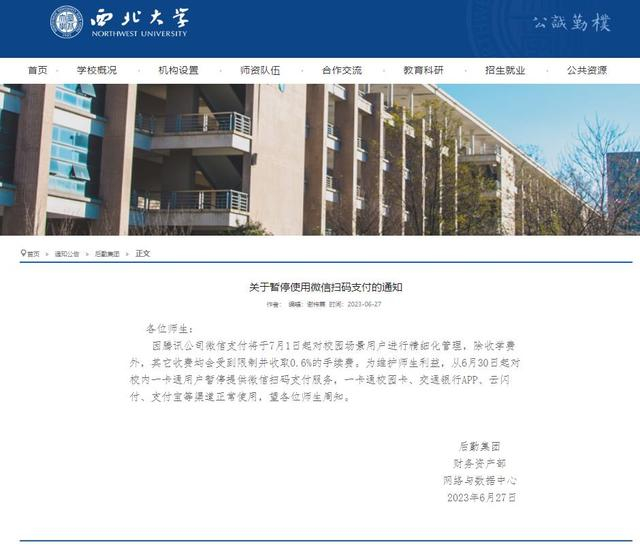 西北大学发布的公告称,“因腾讯公司微信支付将于7月1日起对校园场景用户进行精细化管理,除收学费外,其它收费均会受到限制并收取0.6%的手续费。为维护师生利益,从6月30日起对校内一卡通用户暂停提供微信扫码支付服务,一卡通校园卡、交通银行App、云闪付、支付宝等渠道正常使用,望各位师生周知。”