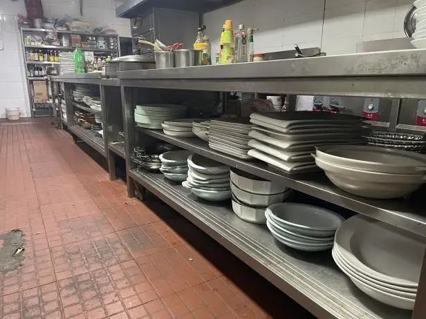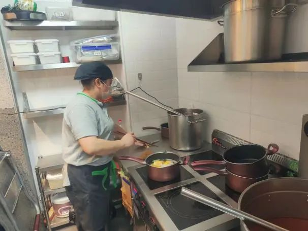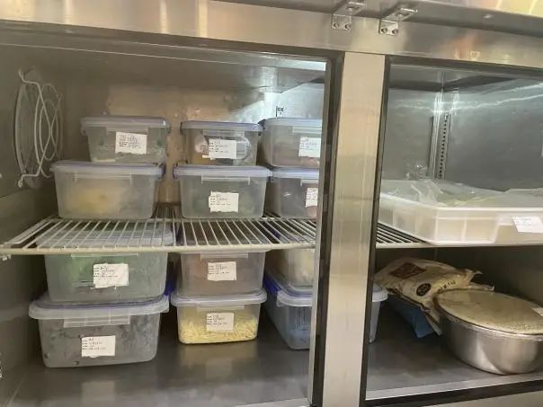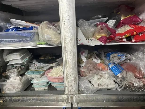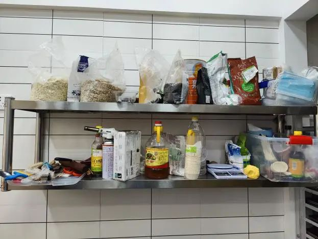 2、烹饪间储藏柜内杂乱,员工私人物品随意摆放。