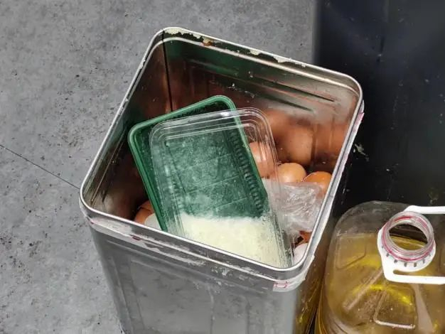 4、垃圾未分类,垃圾桶不带盖,油打开后未加盖保存。