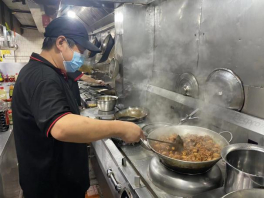 1、员工佩戴口罩、工作帽,着工作服从事食品加工制作。