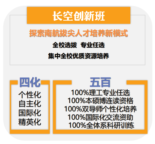南京航空航天大学于2018年实体化建设“长空学院”,次年在此基础上选拔出60名优秀学生组成“长空创新班”,积极探索拔尖人才培养新模式、新机制、新内涵。