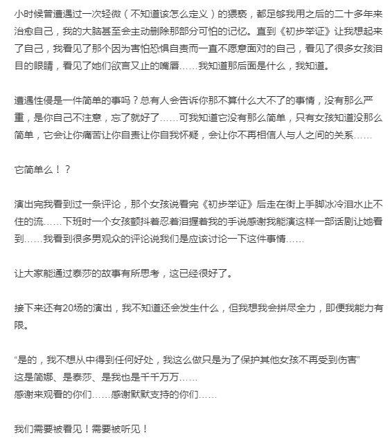 她在文中写道:“小时候曾遭遇过一次轻微(不知道该怎么定义)的猥亵,都足够我用之后的二十多年来治愈自己,我的大脑甚至会主动删除那部分可怕的记忆。直到《初步举证》让我想起来了自己……”“遭遇性侵只有女孩知道没那么简单,它会让你痛苦让你自责让你自我怀疑,会让你不再相信人与人之间的关系。”