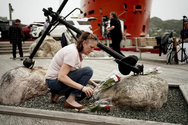 当地时间2023年6月23日,加拿大纽芬兰,圣约翰港的居民帕齐·鲍尔在国王海滩的一个锚前献花,悼念“泰坦”号遇难者。图/视觉中国