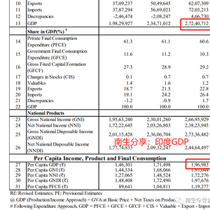印度统计局在近期发布的2022-23财年(简称2023财年,是从2022年4月开始到2023年3月份结束的年度范围)报告显示:完成的名义GDP为2724071.2亿卢比,人均GDP为196983卢比。