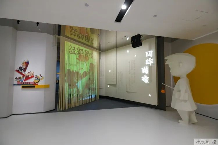 三楼的“回眸璀璨”儿童出版馆以手提小桔灯的小灵通形象带观众走进展馆,讲述童书百年发展史。小朋友能在参观过程中了解不同历史时期的童书历史,大朋友在展厅中找回童年记忆。