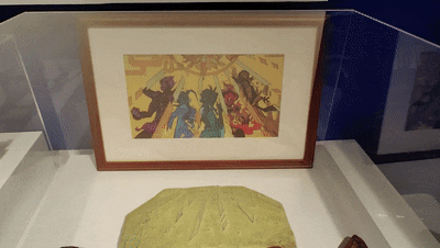 三楼的“数字技术还原石窟”呈现的是位于新疆拜城县克孜尔镇东南的克孜尔石窟38窟全景,17窟最精彩的壁画部分和库木图拉石窟的穹顶。利用现代数字技术,对文物进行三维扫描、数据处理与建模,实现图像数据高清采集、图像处理完美还原、图像输出真实再现,还原了石窟的整体结构和壁画色彩,让观众在欣赏经过数字化“驻颜”的千年壁画艺术的同时,体验到“印刷无所不能”的艺术魅力。
