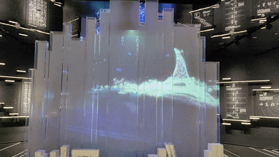 四楼的“穿越时空”数字出版馆,运用了3D Mapping透视投射原理呈现数字出版的历史和现状。以我国数字出版发展的历史、现状为主线,集中呈现传统出版媒介的数字化转型、新媒体的创新发展与网络游戏娱乐出版三大板块的发展成果。结合技术与艺术、交互与巧思,将传统出版和数字出版碰撞出的火花、融合而成的结晶,多维度多形式地展现于此。